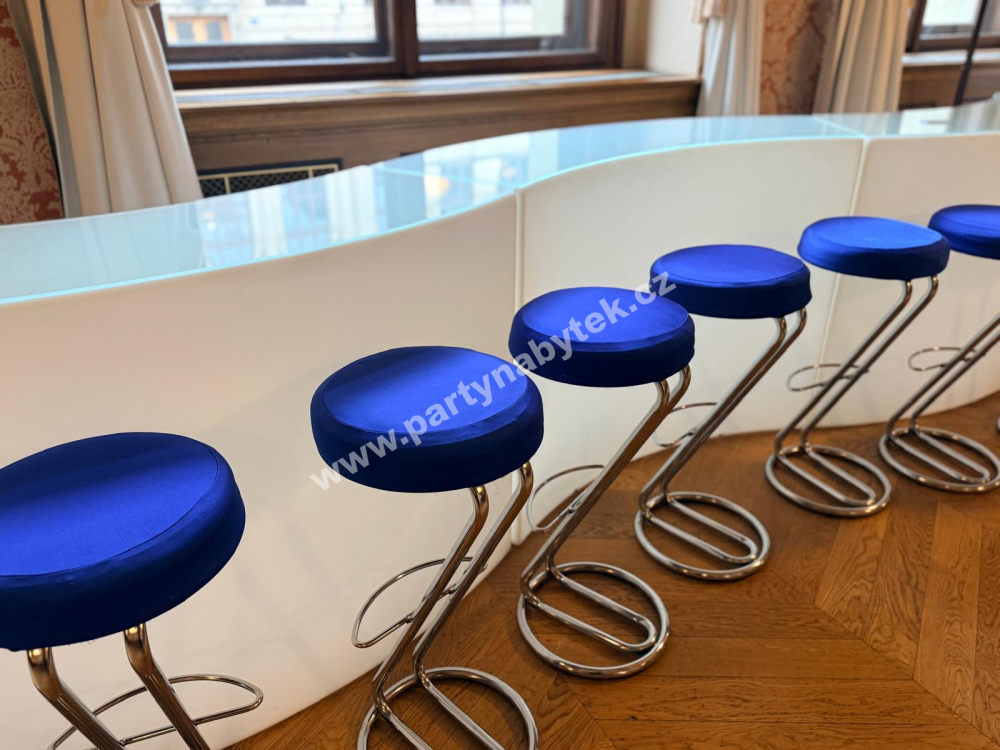 Classic bar stools suitable for all applications. The solid chrome construction with footrest guarantees maximum stability, comfort and load capacity. The seat is softly padded and upholstered in black eco-leather, in this blue version covered with a blue stretch cover.