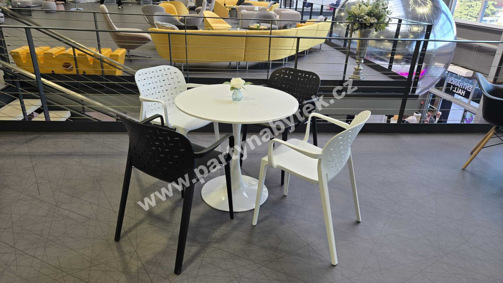 A white table inspired by the Tulip Table style, designed in 1956 by Eero Saarinen, whose essence is the base on one leg, giving the tables an airy and elegant look. The table resembles the stem of a tulip. Solid iconic leg in matt white plastic, on which a white round plate in special ABS plastic sits lightly.