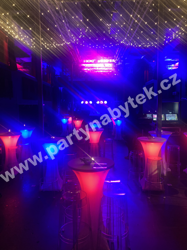 This is a set of plastic bistro table, diameter 60 cm, with 4 legs + LED light + elastic cover for the whole table made of stretch fabric + elastic cover for the table top. A light with its own source (without a cable) is placed underneath the table top. The light can be operated by remote control of different colours. The entire table is covered with a white stretch cover made of elastic material, which turns the bistro table into an elegant table suitable for a prominent party in an easy and quick way.