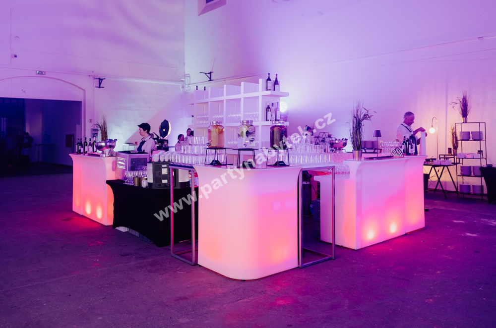 The bar is complemented by a battery-operated RGB LED backlight with a remote control that allows different colour and intensity functions. It lights up with its own source without a cable, with duration of about 8 hours.