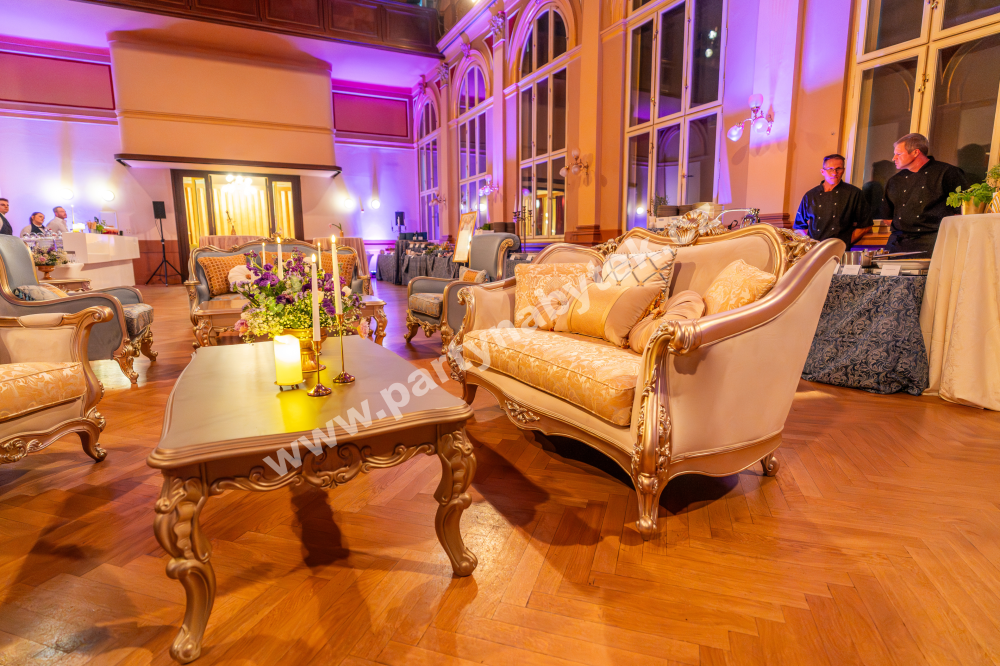 Stylish castle sofa from the collection of antique replicas impresses with its distinctive design. Baroque furniture consists of some of the most beautiful pieces of furniture ever created, characterised by elegance, refinement and luxurious decoration. Surrounded by antique furniture, you will feel the charm of a bygone era when taste and a sense of beauty were at their highest level. Even modern interiors can be enlivened in this way. High upholstered backs are a dominant feature of Baroque sofas, the back and sides are richly decorated with button stitching. The seats and backrests are made of comfortable, breathable pur foam and are upholstered in golden-cream brocade with floral motifs on the seats. The sturdy beech frame, twisted legs and distinctive Baroque flower-shaped decoration with hand-carved accents in every detail give the furniture maximum elegance.