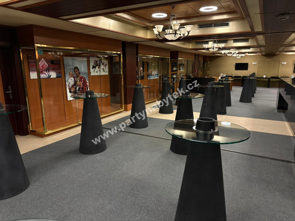 Stůl má celkovou výšku 120 cm, přičemž kulatá deska z čirého skla o pr. 70 cm je ve výšce 110 cm.  Uprostřed černého kuželovitého základu stolu je prostor, do kterého lze vložit chladič na láhve (není součástí ceny půjčovného).