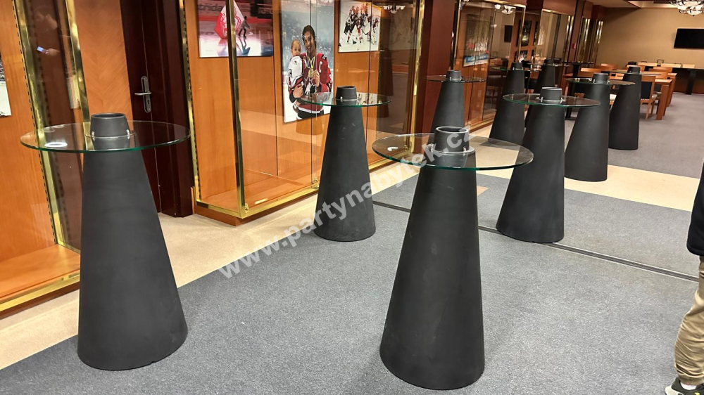 Stůl má celkovou výšku 120 cm, přičemž kulatá deska z čirého skla o pr. 70 cm je ve výšce 110 cm.  Uprostřed černého kuželovitého základu stolu je prostor, do kterého lze vložit chladič na láhve (není součástí ceny půjčovného).