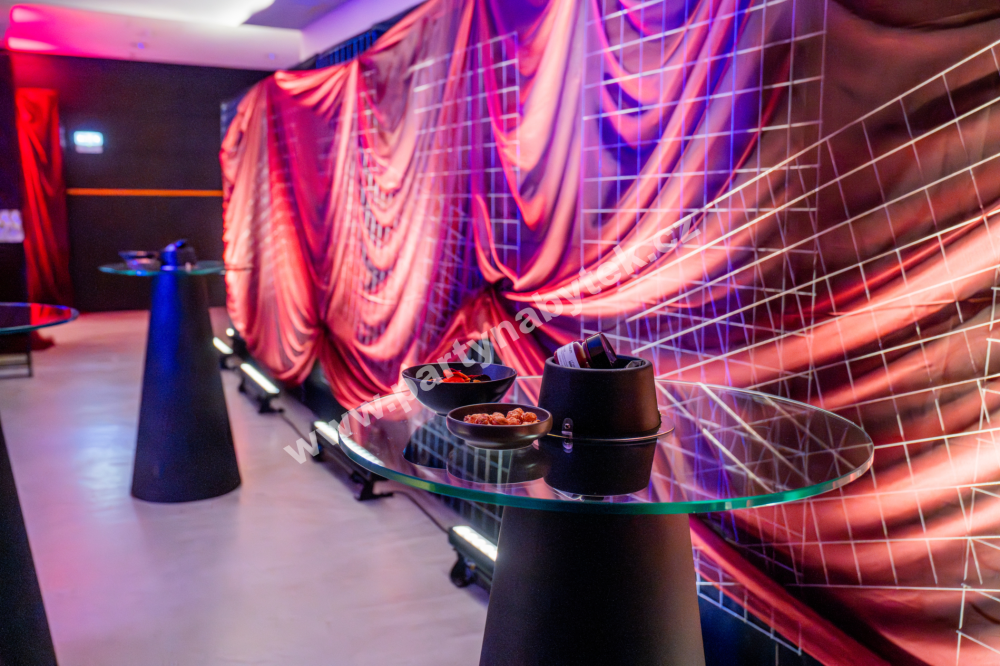 Stůl má celkovou výšku 120 cm, přičemž kulatá deska z čirého skla o pr. 70 cm je ve výšce 110 cm. Uprostřed černého kuželovitého základu stolu je prostor, do kterého lze vložit chladič na láhve (není součástí ceny půjčovného).