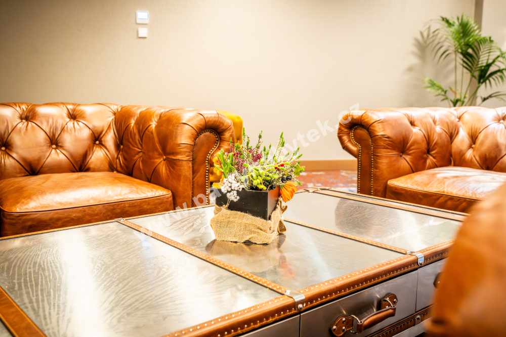 Pokud toužíte po elegantním nábytku jako z anglického klubu gentlemanů, pak impozantní stolky v provedení starého cestovního kufru Vaše přání bezezbytku splní. Jsou určeny milovníkům skotské whisky a doutníků, kteří se nebojí odlišovat a hledají luxus v každém detailu. Nadčasová klasika působící noblesním dojmem ... štíhlá nerezová konstrukce nesoucí precizně zpracovanou desku v imitaci staroanglického cestovního kufru. Deska kufru je z nerezu, bohatě zdobená přezkami a rámováním z pravé hnědé kůže. Konstrukce z kartáčované nerezové oceli je opatřena krytkami proti oděru podlahy. Tento stolek doporučujeme kombinovat s odkládacím stolkem Whisky Table, zejména se hodí k lounge sestavám Chesterfield.
