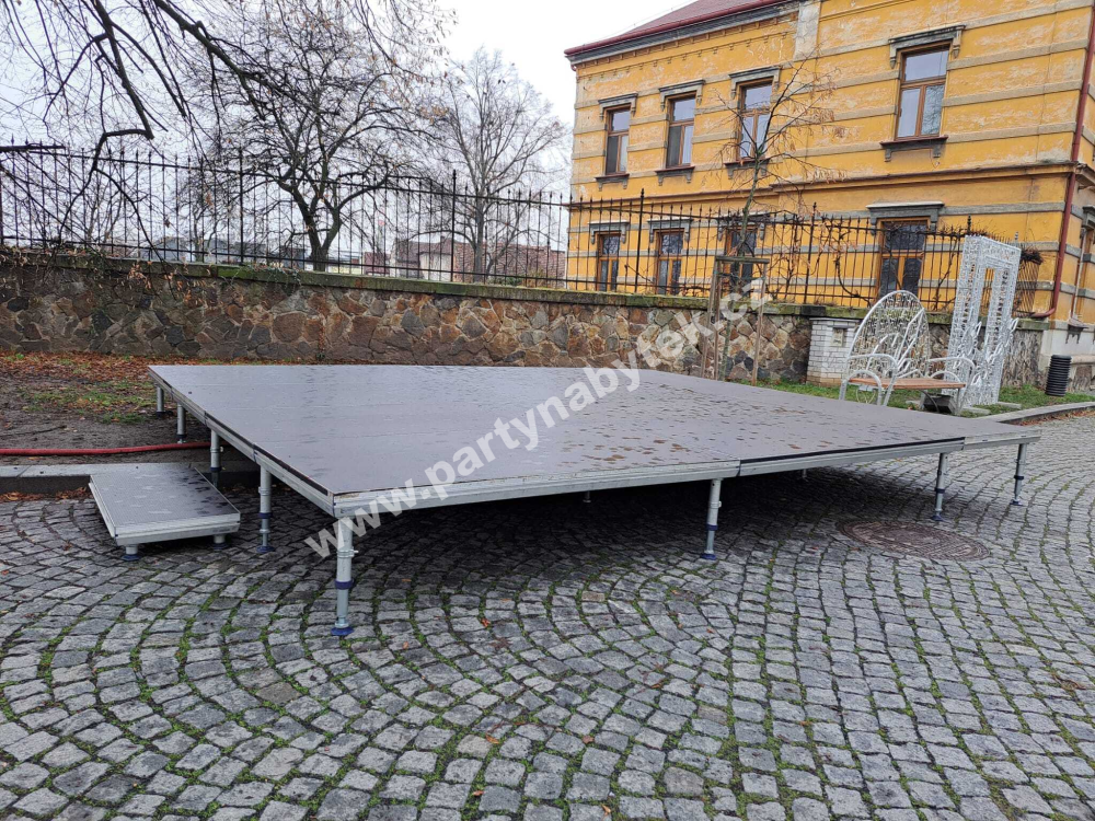 Schůdky, boční krytí ani koberec nejsou součástí ceny pódia.
