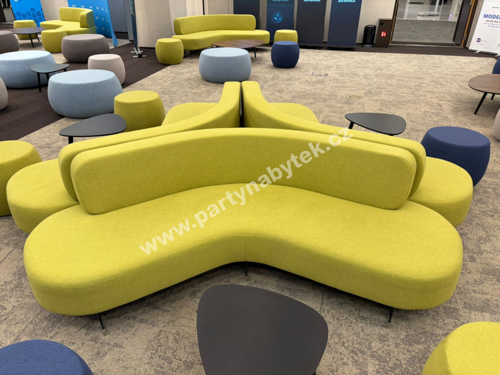 Půvabná pohovka z řady Lobby je určena milovníkům moderního stylu a elegance. Nepravidelný prohnutý tvar pohovky je ideální volbou do větších a vzdušných interiérů, díky celočalouněnému povrchu se skvěle hodí do volného prostoru. Masivní korpus je polstrován PU pěnou a čalouněn příjemnou tkaninou ze 100% polyesteru. Vzdušný vzhled pohovce dodávají 3 lesklé chromované podnože. Vynikne také v kombinaci s více pohovkami typu Lobby, kdy při spojení opěráky vytváří imposantní středové trojúhelníkové lounge.