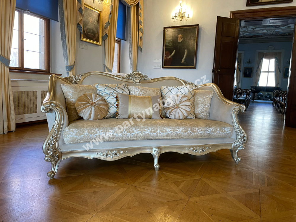 Stylové zámecké sofa z kolekce starožitných replik zaujme svým osobitým designem. Barokní nábytek patří k tomu nejkrásnějšímu, co bylo v nábytkářství vytvořeno, je charakteristický elegancí, noblesou a luxusním zdobením. V obklopení starožitného nábytku na vás dýchne kouzlo dávno zašlých časů, kdy byl vkus a smysl pro krásu na nejvyšší úrovni. Takto se dá oživit i moderní interiér. Vysoká čalouněná opěradla jsou dominantním rysem barokních sofa, zadní i boční části jsou bohatě zdobeny prošíváním s knoflíky. Sedáky a opěráky jsou z pohodlné prodyšné pur pěny a jsou čalouněny brokátem ve zlato-krémových odstínech s květinovými motivy na sedácích. Stabilní bukový rám, kroucené nohy a výrazné zdobení ve tvaru barokních kvítek s ručně vyřezávanými akcenty v každém detailu dodávají nábytku maximální eleganci. Dřevěné části jsou ve zlatém odstínu s dobovou patinou. Sofa je doplněno 6 dekoračními polštářky umocňujícími noblesu.