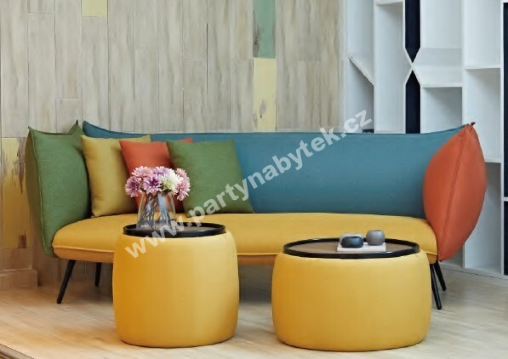 Kruhový lounge stolek ve stylu taburetu z řady Lobby je určen milovníkům moderního stylu a elegance. Horní deska s vyvýšeným okrajem, evokující servírovací tác, je vyrobena z laminované MDF v odstínu tmavého ořechu. Masivní korpus je polstrován PU pěnou a čalouněn tkaninou ze 100% polyesteru. Vynikne v kombinaci s taburety a pohovkami řady Lobby, kdy vytváří imposantní barevné lounge.