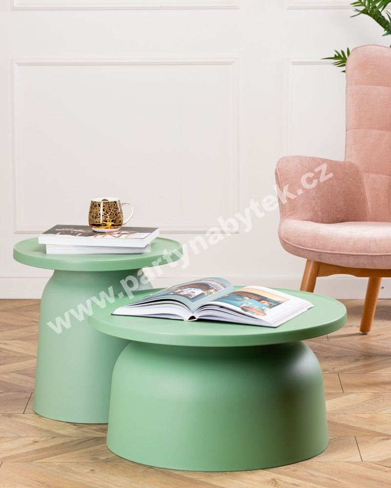 Cena setu obsahuje 2 stolky, každý jiného průměru a jiné výšky (stolek pr. 66,5 cm/výška 37 cm a stolek pr. 47 cm/výška 46 cm)