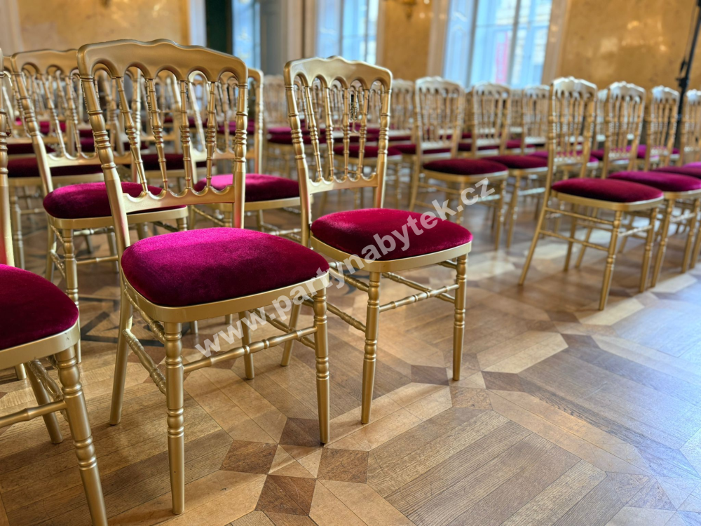 Jedinečné židle starožitného napoleonského vzhledu, splňující normy CATAS – ideální židle pro náročné veřejné prostory. Jedná se o jedny z celosvětově nejrozšířenějších eventových židlí, splňující jakékoliv požadavky – jsou krásné, pohodlné, lehké, avšak velmi stabilní. Zlatý korpus židlí z pryskyřicové směsi je krásně zdobený, opatřený pohodlným semišovým sedákem ve vínové barvě.
