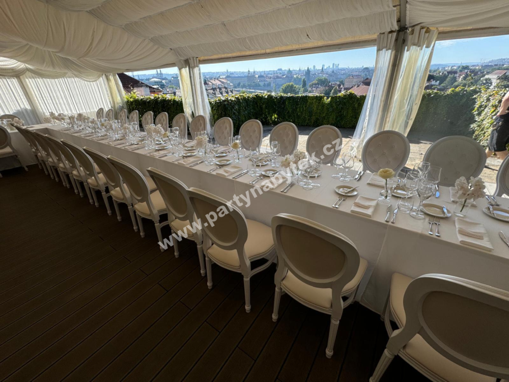 Luxusní čalouněné židle navržené ve Vintage stylu, vynikají svojí zámeckou elegancí evokující luxus. Je to “aristokratka mezi židlemi”. Tyto barokní židle upoutají dokonalým provedením v každém detailu a vnesou eleganci a styl do každé akce. Díky bílému dřevěnému rámu a kvalitnímu polstrování jsou velmi pohodlné. Čalounění z krémově bílé ekokůže je doplněno stylovým buřtováním opěráku, které upoutá na první pohled.